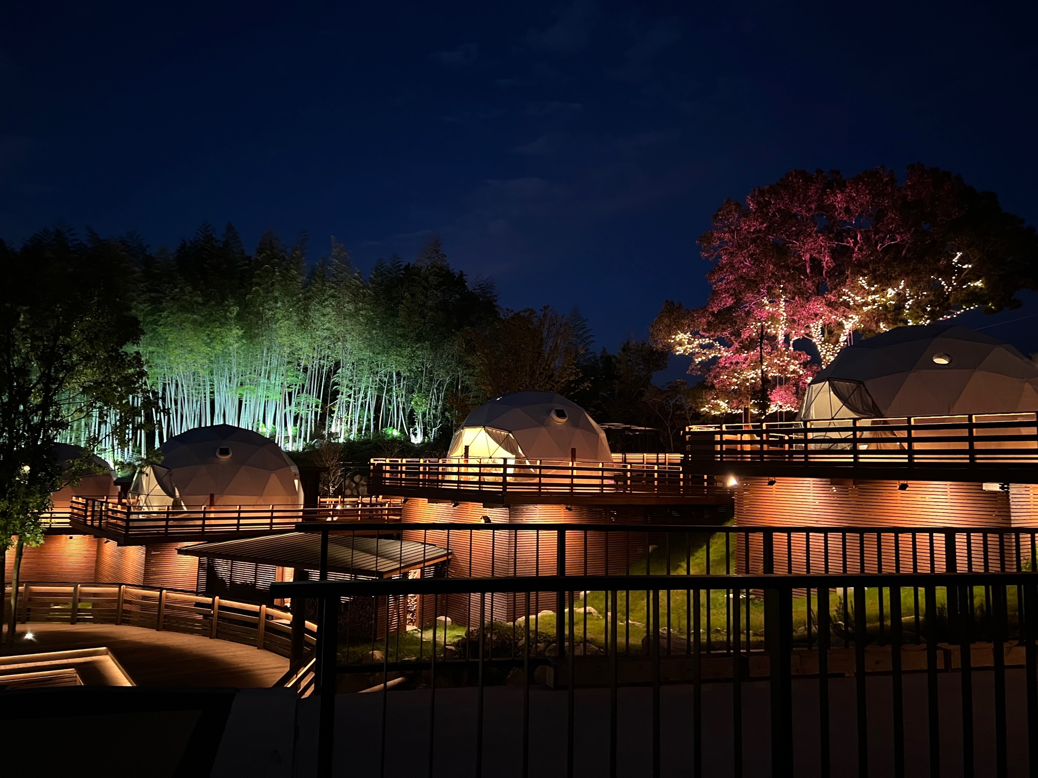映えるライトアップ 本格シェフのいる グランピング五感アメニティと滞在設備:グランピングテントやコテージは快適さを重視した内装で、床暖房や暖房器具、快適な寝具、トイレとシャワー設備を完備している区画が多いです。屋外ダイニングは屋根付きの場所が用意される場合があり、雨天時でも料理を楽しめる配慮がなされています。ラウンジや共用スペースでは、食後にゆったりとした時間を過ごせる座席があり、読書や会話のための落ち着いた環境が整っています。