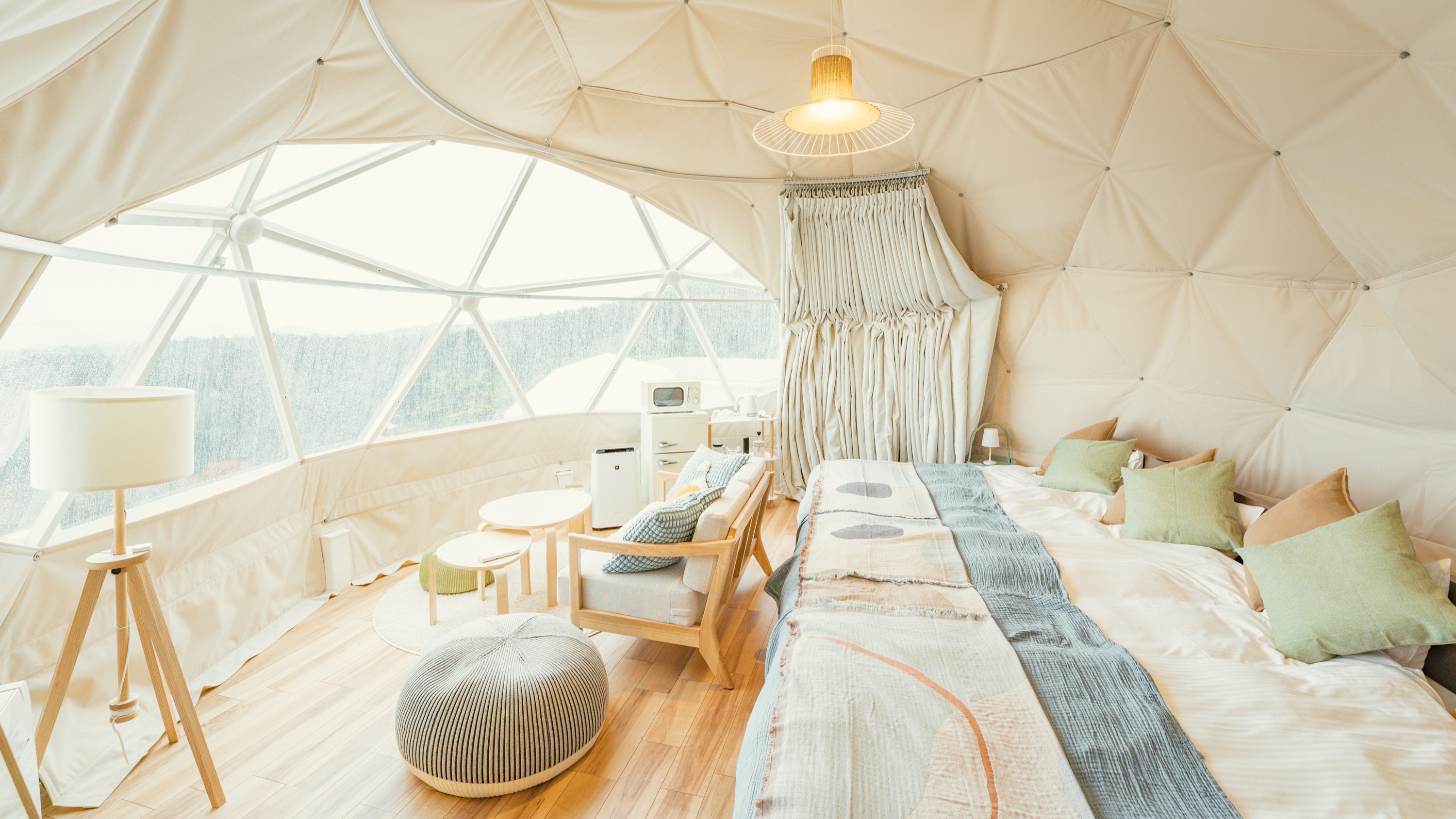 魅力:海と島影を借景にした静かな滞在。設えは居心地を最優先にしてあり、寝具はふかふか、保温設備や専用洗面、温水シャワーを備える区画が中心です。夕暮れは海が刷毛で描かれたように色づき、夜は波音と焚き火の音が寄り添います。食事は地元の漁師や生産者と連携した食材が中心で、炭火で仕上げる一皿や地元ならではの保存食を取り入れたコースが滞在の笑顔を作ります。スタッフによる地元案内や短時間の漁港散策、朝市の紹介があり、土地の息遣いを体感できる点も魅力です。
