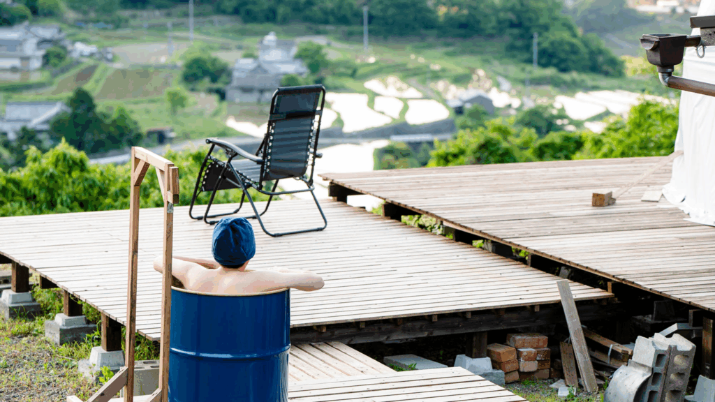 【ウッドデッキ】ドラム缶風呂からの眺めも抜群。日常を忘れゆっくりお過ごしください
