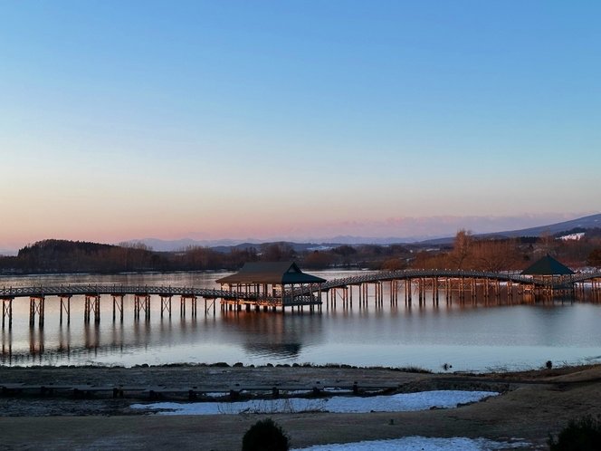 名前と場所:鶴の舞橋と岩木山 絶景の宿 つがる富士見荘(青森県北津軽郡鶴田町)